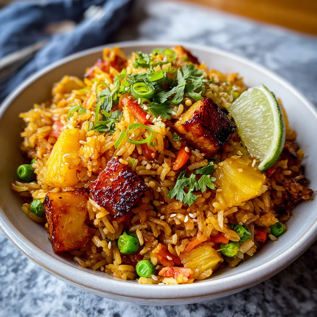 Pineapple fried rice is commonly associated with Thai-inspired cuisine, where sweet and savory flavors are intentionally paired. Traditionally served in a hollowed pineapple, the dish celebrates balance—sweet fruit, salty sauce, aromatic garlic, and rich rice.