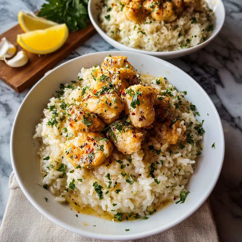 Tender chicken cooked in a garlic butter lemon scampi sauce and served over fluffy rice for a comforting main dish.