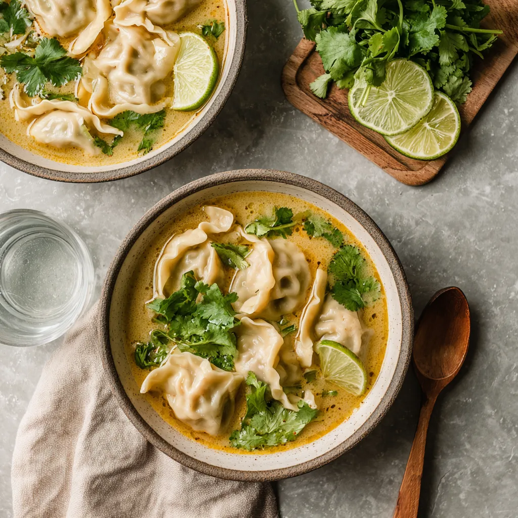 By incorporating dumplings (often associated with Chinese cuisine) into a Thai-style coconut curry broth, this dish becomes a beautiful cross-cultural comfort bowl — modern, approachable, and incredibly satisfying.