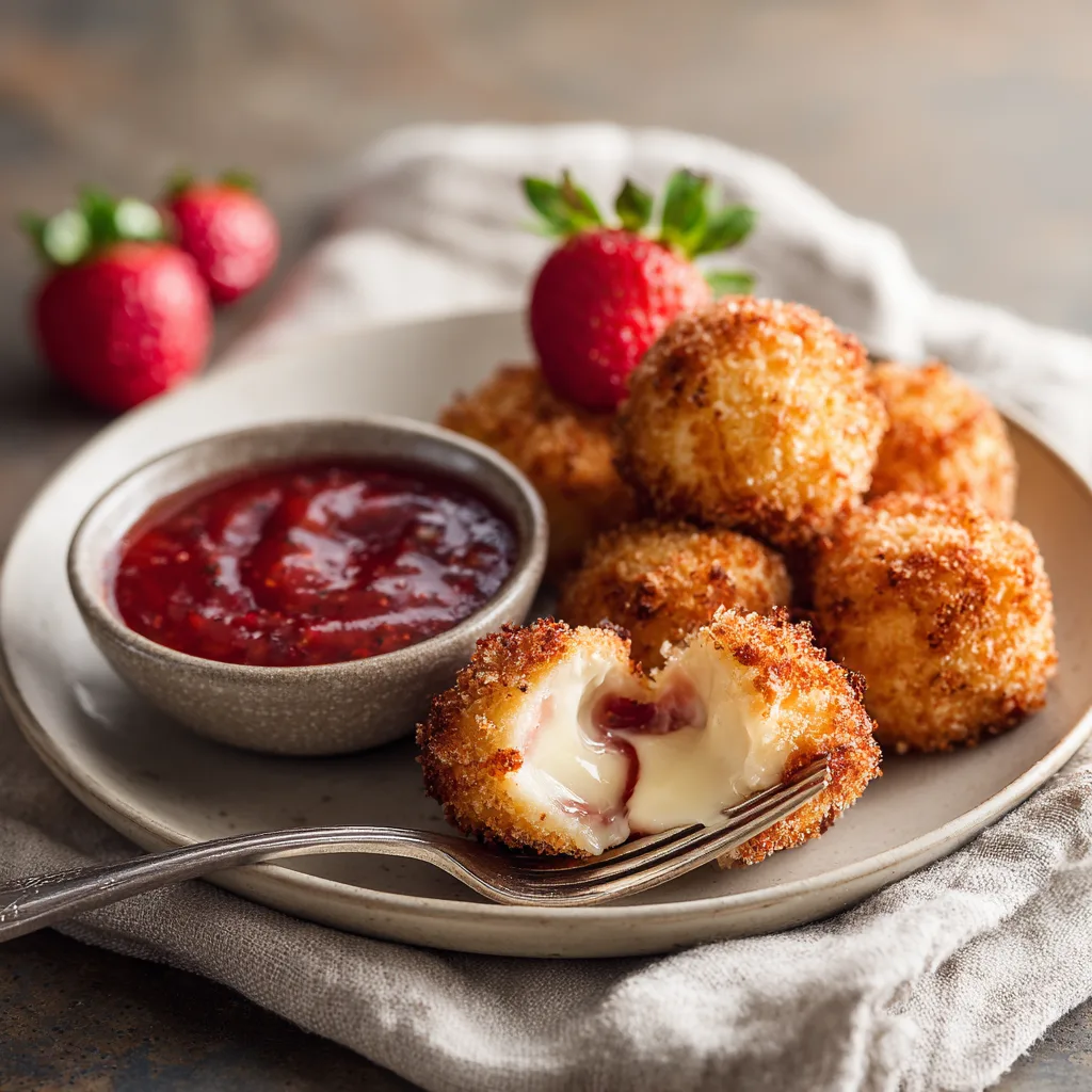 Golden, crunchy cheesecake bites with a creamy strawberry center