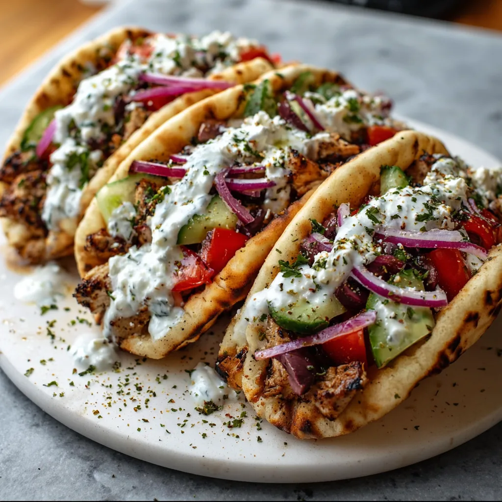 Think warm, soft pita bread folded taco-style and loaded with juicy seasoned chicken, crisp vegetables, briny olives, creamy feta, and cool tzatziki sauce. Every bite is layered with texture and contrast: warm and cool, savory and fresh, hearty yet light. It’s the kind of dinner that feels restaurant-worthy but fits perfectly into a weeknight routine.