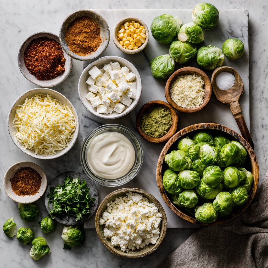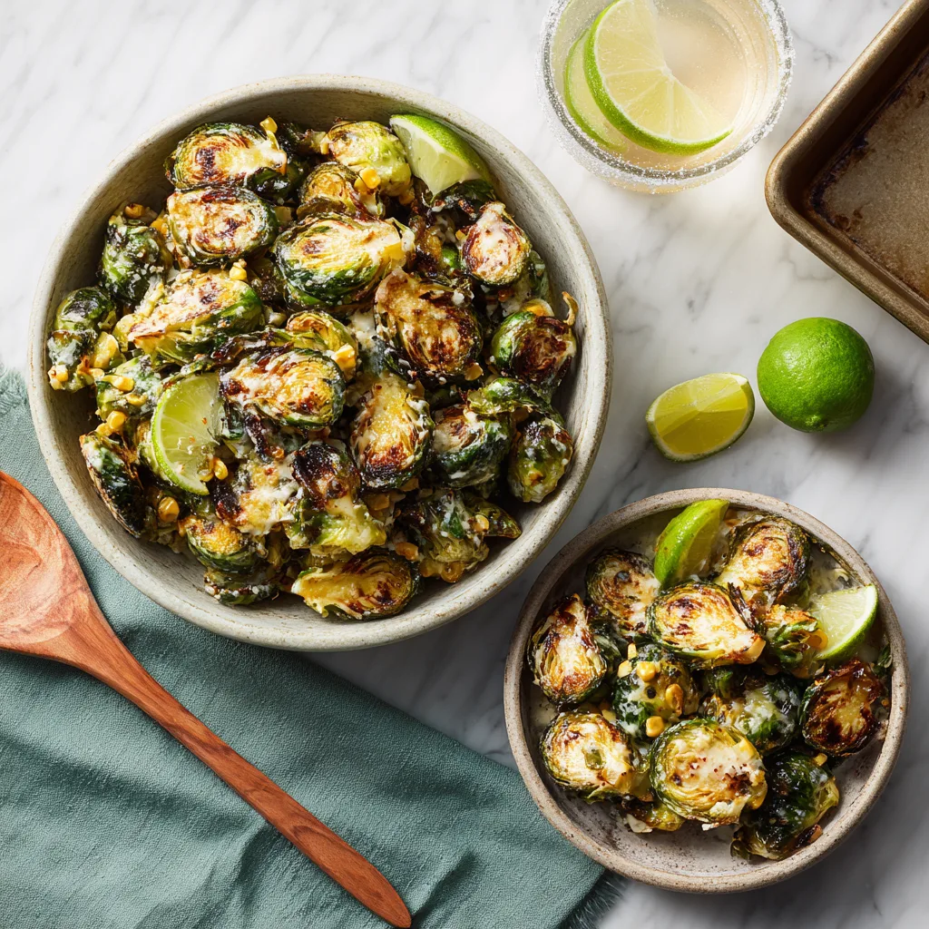 Crispy roasted Brussels sprouts tossed in a creamy elote-style sauce with lime, chili, and crumbled cheese.
