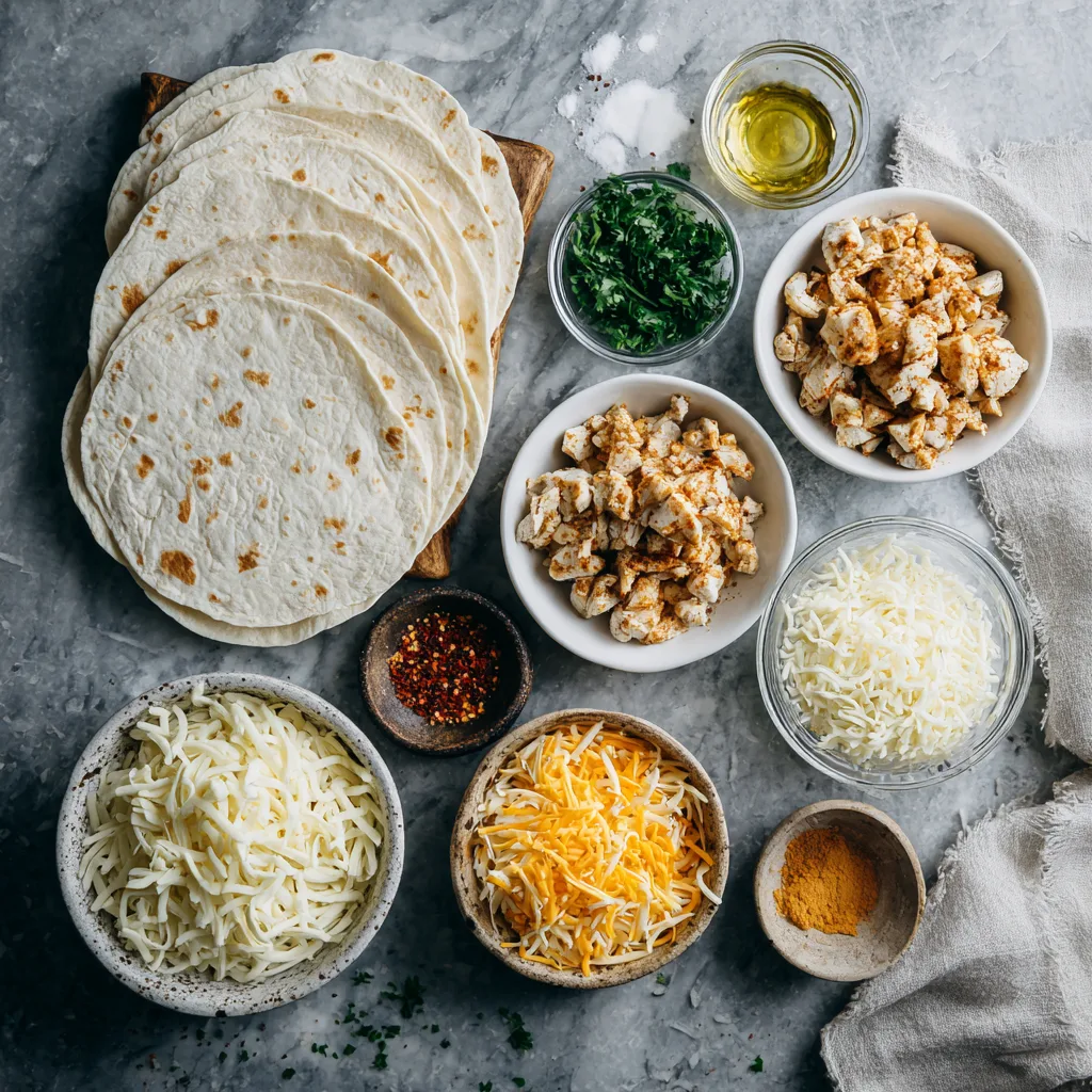 4. Layer cheese and chicken on half of each tortilla.