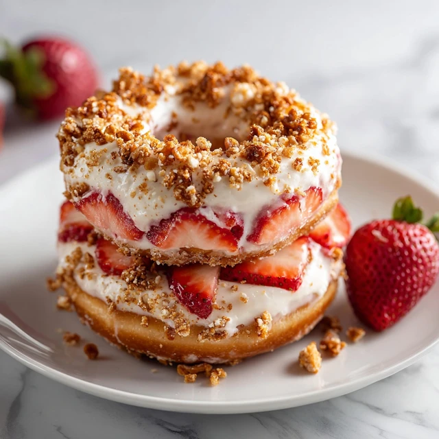 - Layer donuts with cheesecake filling, strawberries, and pretzel crunch.