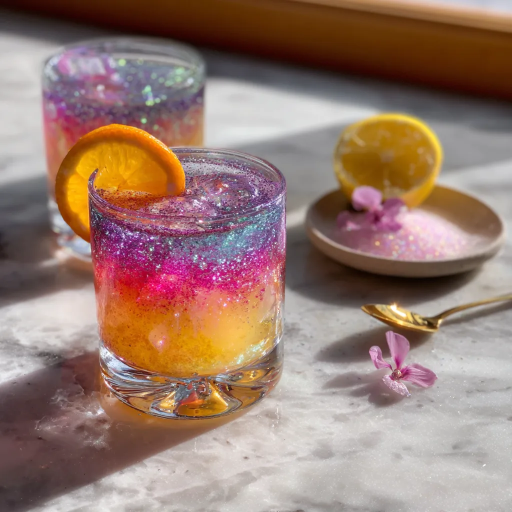 - Sprinkle a small pinch of edible glitter into the glass and stir gently.