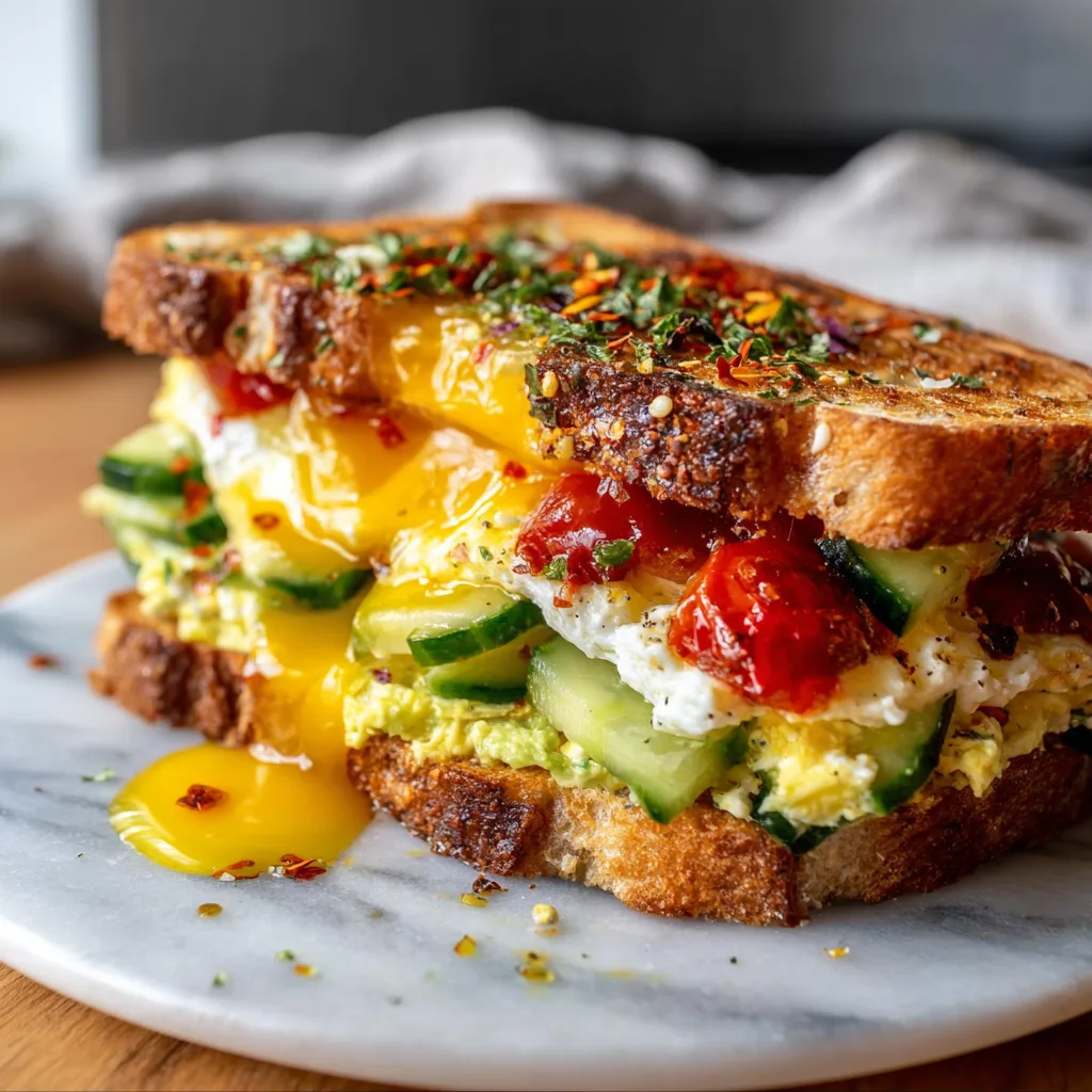 A savory breakfast sandwich layered with fluffy eggs, creamy feta, fresh vegetables, and toasted bread inspired by Mediterranean flavors.